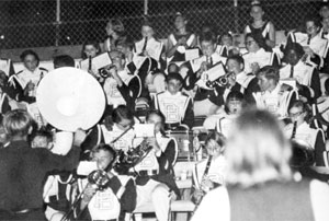 | No body looks very interested in this football game. Could it be possible that we were loosing??? Nah . . . that couldn't be possible. We were probably so far ahead of the other team that it wasn't worth shouting about, right? Larue was doing his best to keep the band spirited. At least he was working up a sweat, even if no one else cared what was going on. |